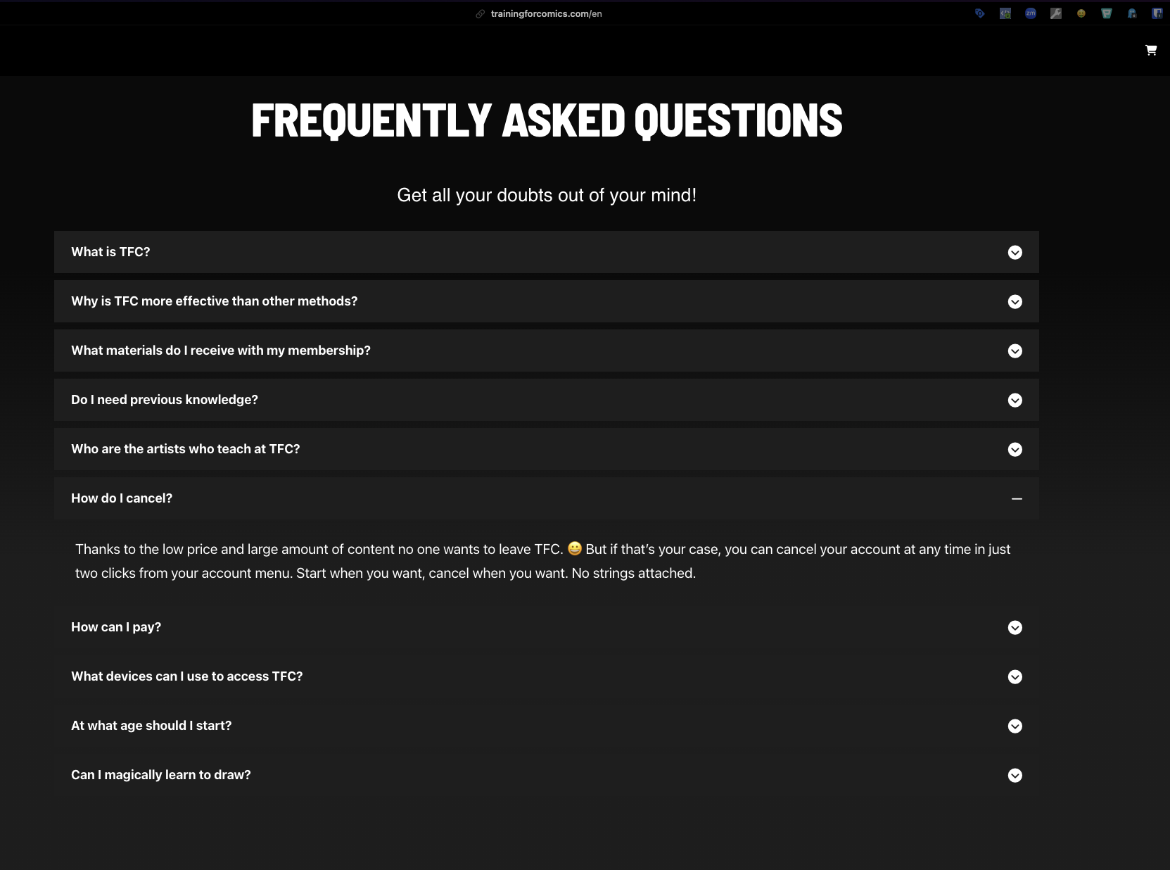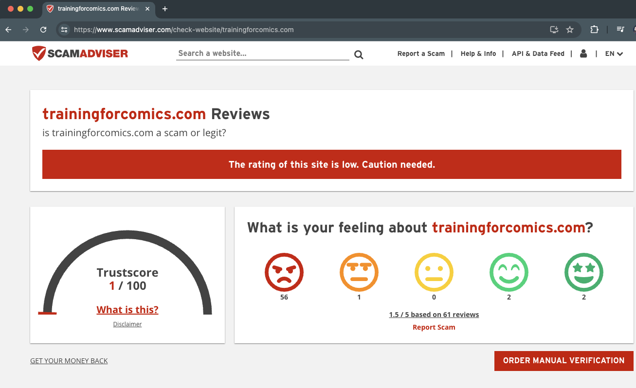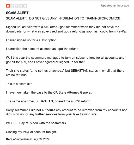 TrainingForComics is a scam site - the owners use the site to collect payment information and then use it to bill you indefinitely, without warning and without any notification. They also hide behind non-existent billing agreements that no one has ever seen.